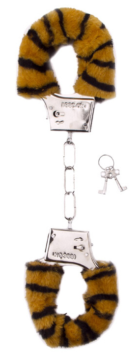 Furry Handcuffs - Tiger- kovová pouta s odnímatelnými plyšovými návleky proti otlakům. Součástí jsou dva klíče. Pouta ale lze otevřít i pomocí bezpečnostní páčky.